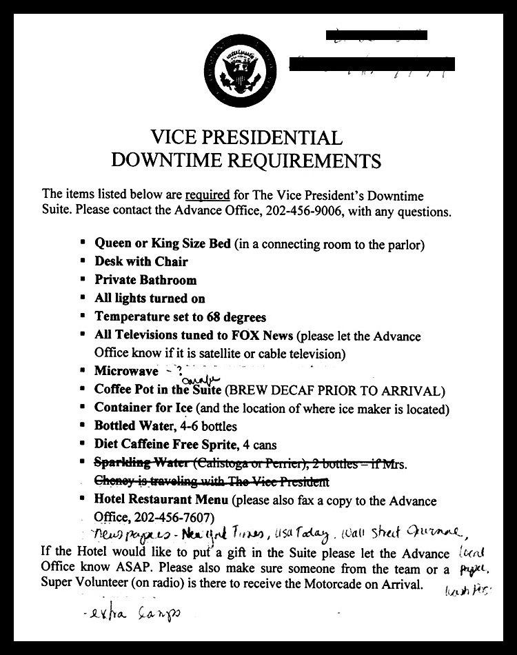 We submit for your consideration a copy of a list of instructions that former Vice President Dick Cheney’s office would send out to all the hotels that hosted him over his 8 years in office. Note the specific instructions regarding the televisions in his suite. If that’s not an overt commentary Cheney’s intellectual limitations and emotional maturity, I don’t know what is. Some people know that the stories Mommy read to help them fall asleep were fairy tales. Too many people insist on applying that strategy for soothing their stress throughout life.