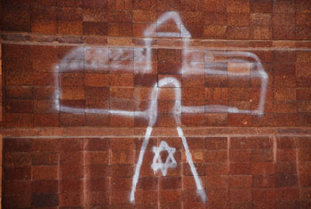 The graffiti, all of which was written in Hebrew, included pronouncements such as: “If Hitler had not existed, the Zionists would have invented him”; “Hitler, thanks for the Holocaust”; “Israel is the secular Auschwitz of the Sephardic Jewry”; and “Jews wake up — the Zionist regime is dangerous.”
