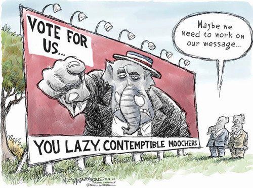 The Republican Party that was defeated in this Presidential race was the new “tea-party” rendition of the GOP: anti-women, anti-immigrant, anti-abortion, anti-LGBT rights, anti any and all social programs that might in any way shape or form assist non-white Christians. The Republican Party of 2012 absolves themselves of all responsibility for, and obligations too, the well-being of “those people” who are, when all is said and done, not “real Americans.”
