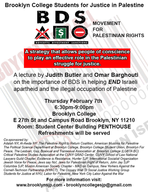symposium that included Judith Butler and Omar Barghouti, two renown activists who are promoting the BDS movement. No critics of BDS or supporters of Israel were invited to participate in this “academic forum” which is being co-sponsored by a number of student groups.