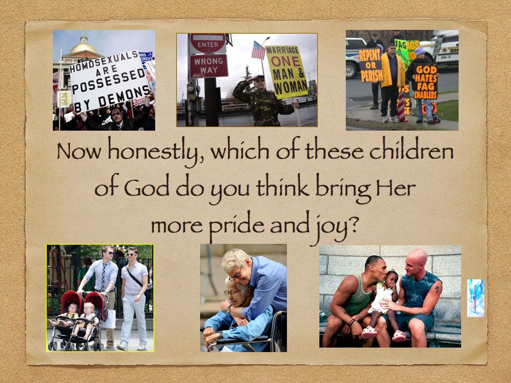 Now, I insist, no, I DEMAND full equality with my heterosexual brothers and sisters and I will settle for nothing less. Yes, I’ve come along way in 9 years and I couldn’t feel more confident of the propriety of my expectations. I’m tempted to also say that somewhere along the way, I also made peace with God about my sexual orientation. But you know what? I don’t believe for a millisecond that God ever had a problem with me or any other LGBT people not being a baby-breeder. God wants every person to give and receive love figuratively, literally, emotionally and spiritually. Any animal can reproduce, only a mensch, a decent, kind, loving, responsible human being can be an excellent parent REGARDLESS OF SEXUAL ORIENTATION.