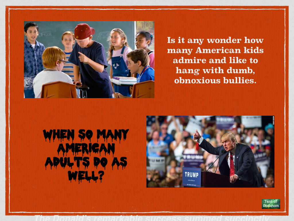 Uncategorized Has America’s Love Affair With Bullies Ever Been More Evident? Date: September 10, 2015Author: Mitchell S. Gilbert 0 Comments Given a choice, many Americans will always be more attracted to cocky, assertive and dumb than humble and smart. And that’s why we have so many of our kids who are bullies. Bullies are crowd pleasers. And isn’t that sad? Share this: Click to share on LinkedIn (Opens in new window) LinkedIn Click to share on Facebook (Opens in new window) Facebook Click to email a link to a friend (Opens in new window) Email Click to share on X (Opens in new window) X Click to share on Tumblr (Opens in new window) Tumblr Click to print (Opens in new window) Print Click to share on Reddit (Opens in new window) Reddit Click to share on Pinterest (Opens in new window) Pinterest Click to share on Pocket (Opens in new window) Pocket Click to share on Telegram (Opens in new window) Telegram Click to share on WhatsApp (Opens in new window) WhatsApp Like Loading...